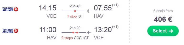 Benetke (VCE) – Havana (HAV) – Benetke (VCE), že za 406 eur (ang. povezava skyscanner)