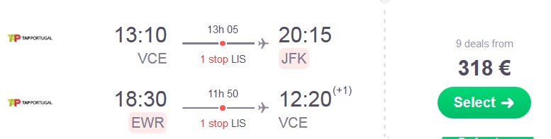Informacija o letu: 1 postanek, prtljaga NI vključenaPrimer povratne letalske povezave iz Benetk v New York: