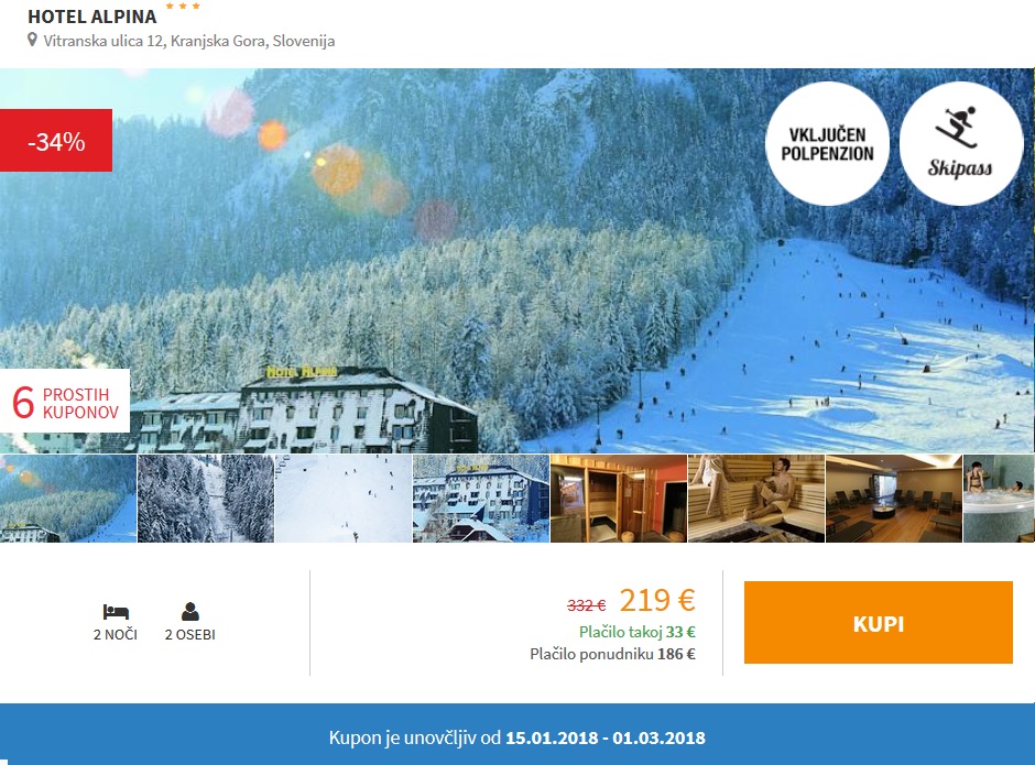 Kupon je unovčljiv od 15. 1. do 1. 3. 2018 (doplačilo za bivanje od četrtka do nedelje znaša 10 €/noč/soba)