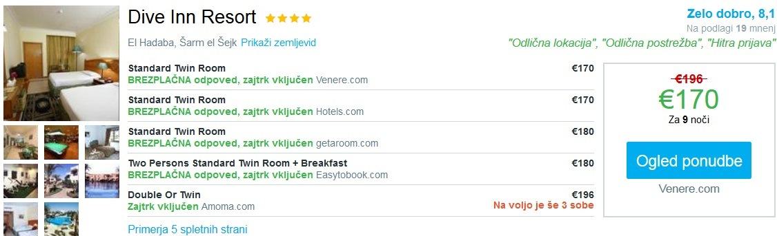 V Šarm el Šejku je na voljo 9 nočitev (za termin 21.-30.1.2016) v zelo dobro ocenjenem hotelu s 4*Dive Inn Resort, kjer je cena za dve osebi z zajtrkom že za 170 eur.