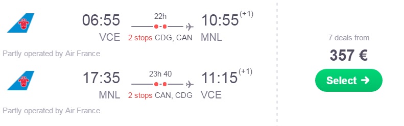 Informacija o letu: 2 postanka, check in prtljaga je vključenaPrimer povratne letalske povezave iz Benetk v Manilo (npr termin 16.05.-03.06.2018):