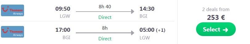 Primer povratne letalske povezave iz Londona na Barbados (npr termin 04.12.-18.12.2016):