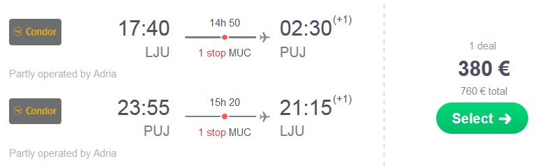 Ljubljana – Punta Cana, Condor, 1 postanek, prtljaga je vključena, 380 eur/osebo