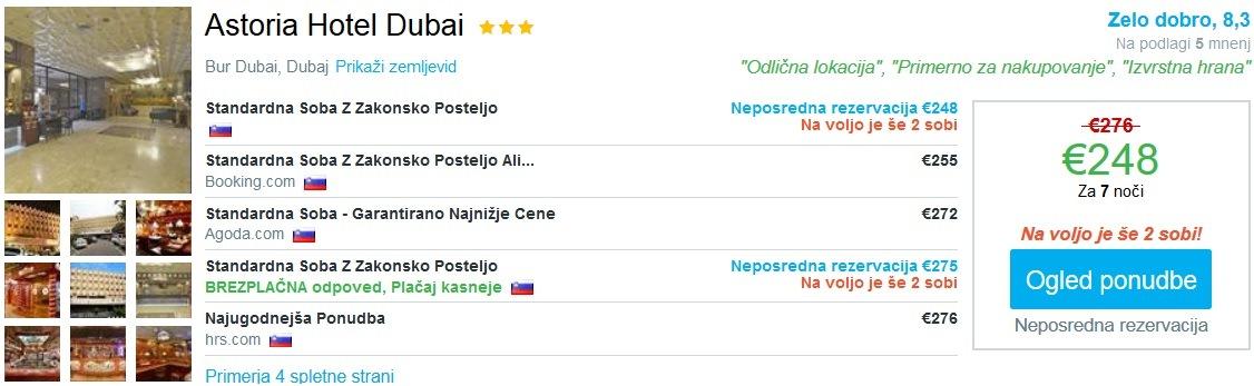 V Dubaju je na voljo 7 nočitev (za termin 1.9.-8.9.2016) v zelo dobro ocenjenem hotelu s 3*Astoria Hotel Dubai, kjer je cena za dve osebi že od 248 eur. TripAdvisor oceno si lahko ogledate TUKAJ.