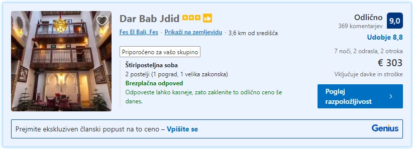 Seštevek cene primera paketa (letalo + nastanitev) za 7 noči bivanja v Maroku tako znaša 407 eur za 4 osebe (oz. 102 eur na osebo).