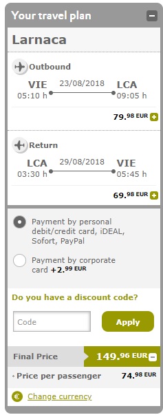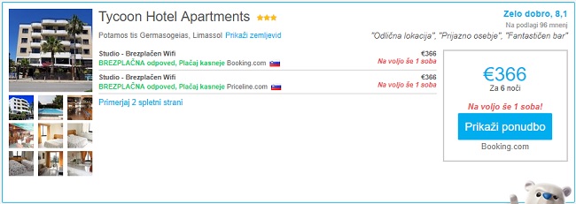 Skupna cena celotnega paketa 6 dnevnega dopusta za dve osebi (letalo + prenočišče) na Cipru tako znaša 516 eur (oz. 258 eur na osebo).