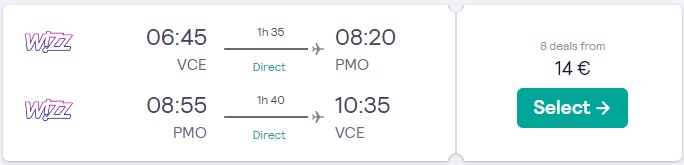 Primer povratne letalske povezave iz Benetk v Palermo (26.04. – 03.05.2022)