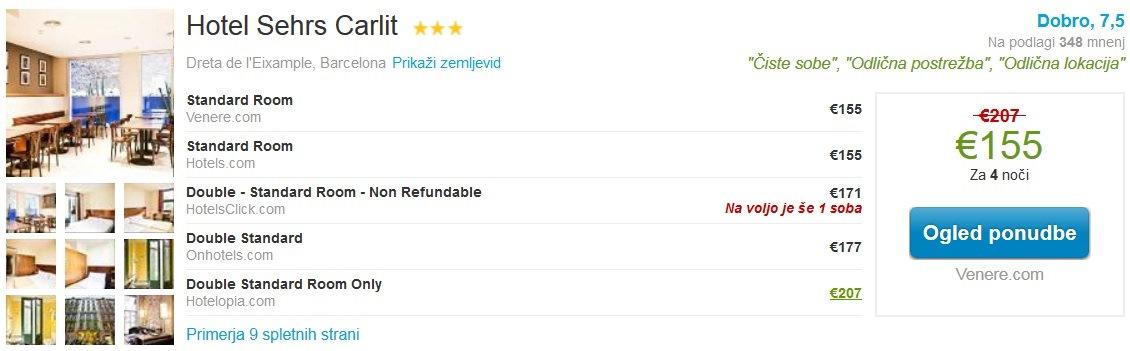 V Barceloni so na voljo 4 nočitve (za termin 11.12. – 15.12.2015) v hotelu v bližini Sagrade Familie s 3*Hotel Sehrs Carlit, kjer je cena za dve osebi že od 155 eur