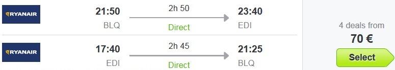 letaloBologna – Edinburg, Ryanair, prtljaga ni vključena, 70 eur/osebo