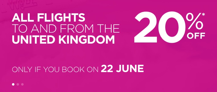 Nizkocenovna letalska družba Wizz Air vam ponuja akcijo 20% popusta na vse lete v/iz Londona. Akcija velja za rezervacije samo danes, 22. junija 2017. 20% popust se nanaša na ceno Wizz Air letalske vozovnice s taksami.
