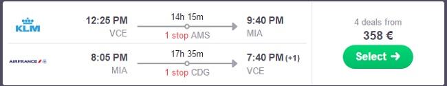 Primer povratne letalske povezave iz Benetk v Miami (npr termin 23.03.-28.03.2017):