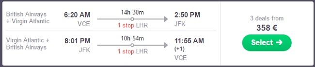 Primer povratne letalske povezave iz Benetk v NYC (npr termin 07.03.-19.03.2017):