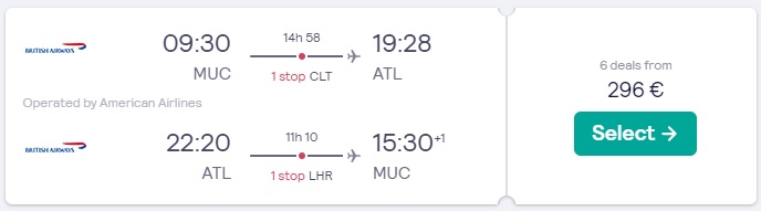 Atlanta (ATL), že za 296 eur