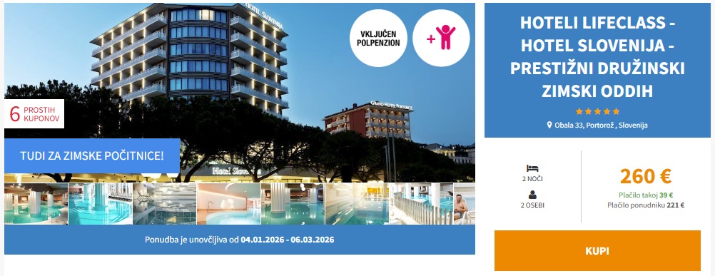 Ponudba je unovčljiva do 6. 3. 2026 (doplačilo za bivanje med vikendom (petek in sobota) znaša 5 €/oseba/noč)