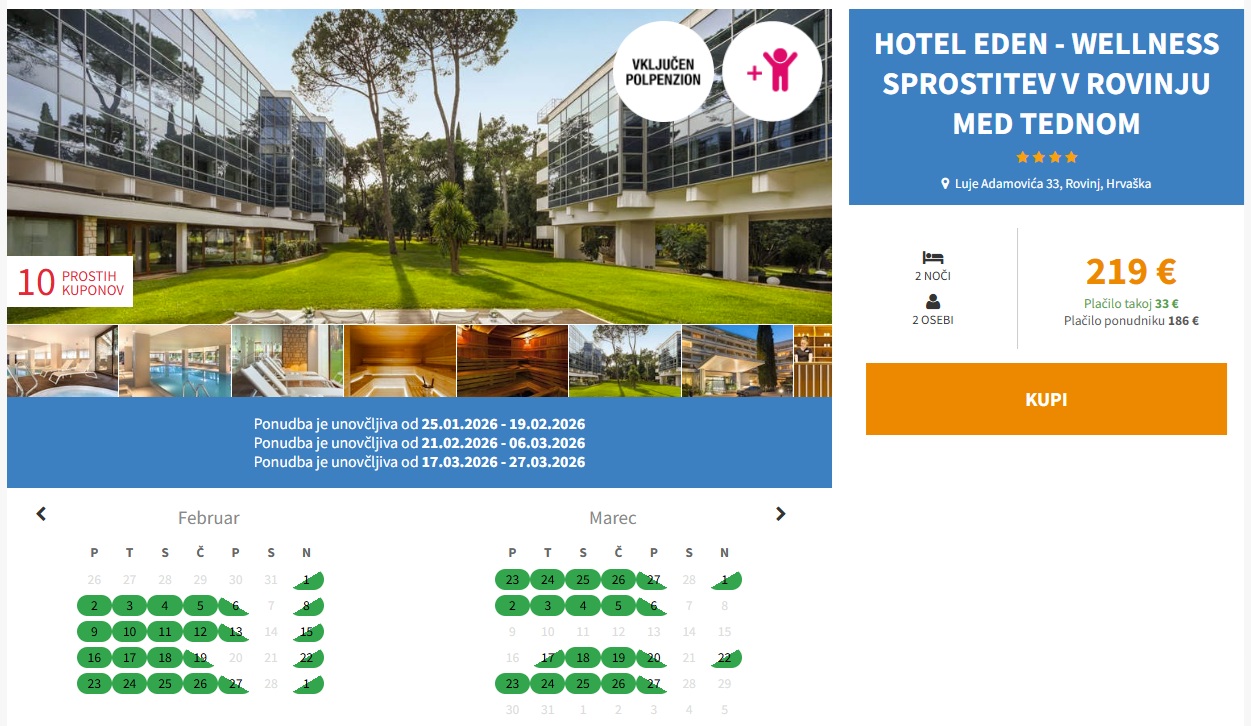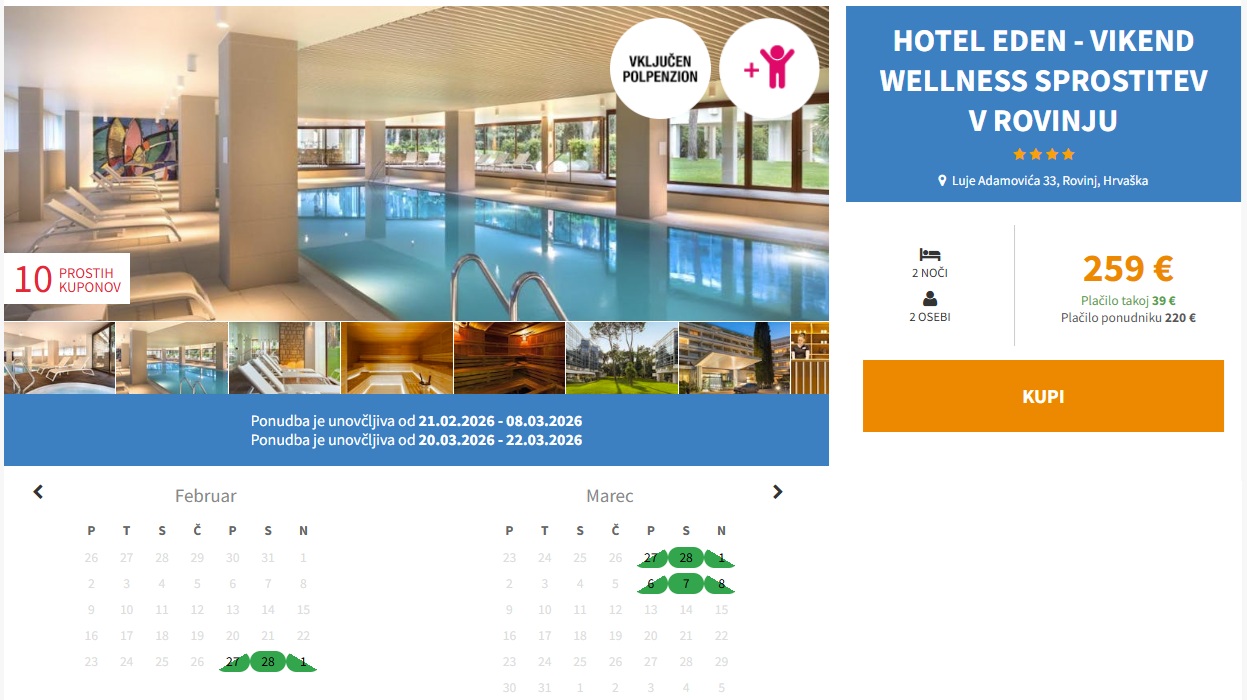 Ponudba je unovčljiva do 19. 2., od 21.02. do 6. 3. 2026 in od 17. 3. do 27. 3. 2026 (bivanje od nedelje do petka)