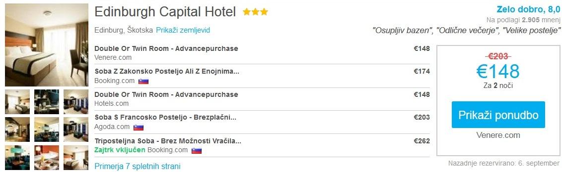 Benetke – Edinburg, EasyJet, prtljaga ni vključena, 62 eur/oseboPrimer hotelske namestitve v Edinburgu (16.12.-18.12.2016):
