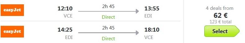 Skupna cena celotnega paketa 4 dnevnega dopusta za dve osebi ( letalo + hotel) v Edinburgu tako znaša 271 eur (oz. 136 eur na osebo).